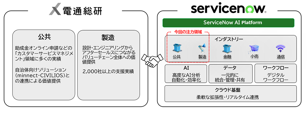 電通総研は、ServiceNow Japanとパートナーシップ契約を締結し、両社の技術とノウハウを融合させた統合型DXソリューションを製造業・公共分野向けに提供すると発表した。電通総研は、ServiceNowが提供する「ServiceNow AI Platform」の国内販売代理も担い、プラットフォームを活用したDX推進を加速させる。